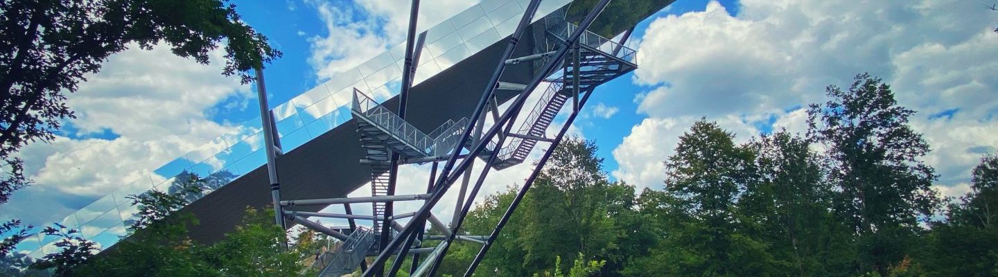 In addition to the remarkable design of the big piste, where the round columns stick out of the ground like random toothpicks, a pathway is also provided between these columns with a stairway. Due to the jagged shape, and with a nod to the Cosmic theme of Kattevennen, this construction is also known as the lightning stairway. At the top, the stairway gives access to a platform with a view across the “National Park Hoge Kempen”. If you have the nerve to go even higher, you can use a stairway that starts from this platform and passes through the piste. This allows not only a great view of the piste from above, but also an even higher view of the National Park. You are then at a height of around 40 metres above the ground level.